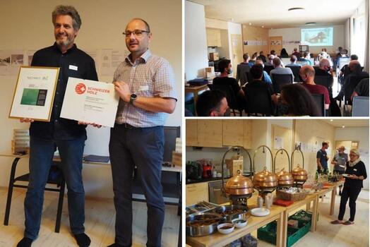 The certificates prove the use of Swiss wood and the storage of a total of 222 tons of CO₂: Thomas Lüthi from the Initiative Holz BE and Stefan Zöllig handing over the certificate.